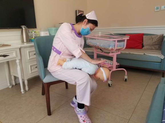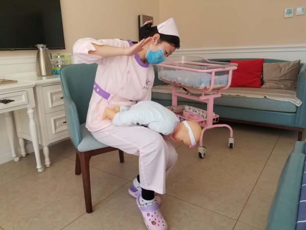 操作方法:立即將患兒取頭低腳高位,俯臥在施救者腿上,讓嬰兒上身前傾45~60度,施救者左手虎口打開、托住嬰兒下頜、打開氣道,用右手掌跟大魚際部位用力扣拍嬰兒背部4—5次,具體位置為背部肩胛骨中間,通過振動(dòng)使吸入呼吸道的奶汁或痰液排出。